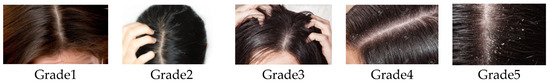 Pictures illustrating the five grade categories used to score the severity of white flakes presence on the scalps of volunteers.