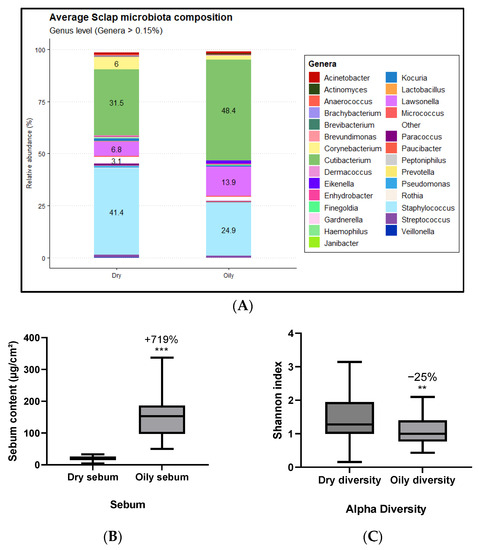 To understand this variation in alpha diversity, the impact of Pogostemon cablin extract on Cutibacterium relative abundance was analyzed after 28 days of application, previously identified as a biomarker of dry scalp improvement. An important decrease of Cutibacterium proportion (−18.5%) was shown after 28 days of placebo application while the active ingredient induced an increase of the relative abundance of Cutibacterium by +22% in comparison with the placebo formula (Figure 8B). Our results confirmed that the variation in alpha diversity is correlated with the variation in the relative abundance of Cutibacterium on scalp, which raises questions about the amount of sebum produced by the scalp with the active ingredient.