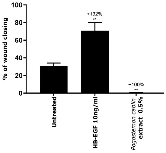 NHEKs were seeded in 12-well plates pre-coated with type I collagen at 200,000 cells/well in EpiLife medium supplemented with growth factors. After 48 h of incubation, cells were starved overnight with basal medium alone for untreated condition or containing HB-EGF (Sigma-Aldrich, Missouri, USA) at 10 ng/mL as a positive control for migration or Pogostemon cablin extract at 0.5% (v/v). Next morning, a vertical scratch was made in each well with a 200 µL pipette-tip, cells were rinsed 2 times with PBS (Gibco®) in order to eliminate scratched cells, and treatments were applied again. Pictures were taken in bright-field mode just after the scratch and 8 h later with an inverted microscope (Axio Observer, Zeiss, Germany). The scratch area was measured at each time with ImageJ® software version 1.44.
