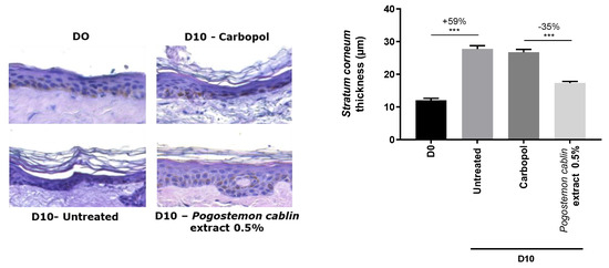 Skin explants from a 70-year-old donor who underwent scalp surgery were kept in culture for 10 days. Explants were topically treated daily with Pogostemon cablin extract at 0.5% (v/v) diluted in Carbopol versus Carbopol control versus untreated control. After 10 days of culture and treatment, skin explants were fixed in formalin and hematoxylin-eosin staining was carried out in order to analyze the stratum corneum thickness. Thickness was measured with ImageJ® software version 1.44.