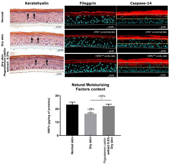 Normal human epidermal keratinocytes (NHEKs), freshly isolated from a 46-year-old donor, were seeded at 300,000 cells per well in 6-well plates pre-coated with type I collagen in the presence of EpiLife medium supplemented with HKGS (Human Keratinocytes Growth Supplements) factors (Gibco®, Life Technologies, Carlsbad, CA, USA). After 48 h of culture, the cells were rinsed two times with Phosphate-Buffered Saline solution (PBS, Gibco®) and allowed to rest in basal medium overnight before being stimulated with Pogostemon cablin extract at 0.5% (v/v) in EpiLife basal medium. After 18 h of treatment, RNAs were extracted according to the Trizol method (Thermo Fisher Scientific, Burlington, MA, USA). RNA quality was controlled and a reverse transcription was performed to obtain cDNA using the Verso cDNA kit (Thermo Fisher Scientific). RT-qPCR was performed on specific pre-coated plates (Applied Biosystems, Foster City, CA, USA) designed to study transcriptomic expression of different genes involved in epidermal function with 10 ng of cDNA per well using CFX96 Touch (Biorad, Hercules, CA, USA) and Universal Taqman mix (Quantabio, Beverly, MA, USA). The relative quantification (RQ) of gene expression was calculated according to ABL1 (ABL Proto-Oncogene 1, Non-Receptor Tyrosine Kinase) and EIF2B1 (Eukaryotic Translation Initiation Factor 2B Subunit Alpha) housekeeping genes.