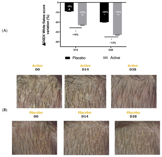 Impact of Pogostemon cablin extract on white flakes production on scalp from volunteers suffering from scalp dryness. (A) White flakes were evaluated and scored by an expert. The significance of the effect of both shampoo after 28 days of application versus day 0 was calculated by applying a Wilcoxon test with # p < 0.1, * p < 0.05 and *** p < 0.001. The effect of Pogostemon cablin extract versus placebo was calculated by applying a statistical Mann-Whitney test with * p < 0.05. (B) White flakes were illustrated with C-Cube® at day 0, after 14 and 28 days of application of a shampoo containing Pogostemon cablin extract (upper panel) or a placebo shampoo (lower panel).