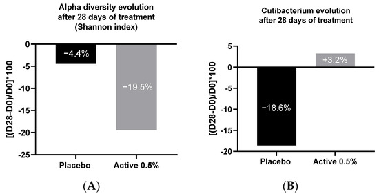 A preliminary study showed a variation in microbiota alpha diversity between dry and oily scalp, correlated with a different relative abundance of Cutibacterium on these two types of scalp. Knowing that, we were interested in studying the impact of shampoo containing 0.5% of Pogostemon cablin extract or placebo on the alpha diversity using Shannon index after 28 days of application. The active ingredient triggered a decrease of the alpha diversity by −15% versus placebo which had a slight effect on the diversity (Figure 8A).