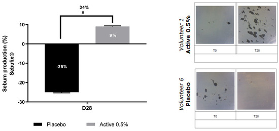 We went further by studying the link between Cutibacterium modulation by the active ingredient and the scalp sebum quantity. After 28 days of shampoo application, placebo shampoo decreased the sebum by −25% in comparison with D0 as shown in Figure 9, while shampoo containing 0.5% of Pogostemon cablin extract slightly increases it by +9%. In addition, we observed a significant improvement of sebum production with our active shampoo showing an increase of +34% in comparison with the effect of placebo shampoo.