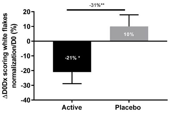 After 28 days of application with hair lotion containing 0.5% Pogostemon cablin extract, a significant reduction of white flakes (−21%) was observed in comparison with D0. The application of the placebo formula in the same condition for 28 days showed a slight increase of white flakes (+10%) in comparison with D0. The comparison between the active ingredient and placebo lotion showed a significant reduction of white flakes (−31%) with active lotion in comparison with placebo lotion after 28 days of application (Figure 10). These results demonstrated the strong efficacy of Pogostemon cablin extract even in leave-on applications on the reduction of white flakes from dry and itching scalp.