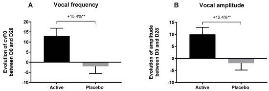 After 28 days of application, active lotion increased the frequency and amplitude more than with placebo lotion. In addition, the active lotion demonstrated a significant increase of vocal frequency and amplitude in comparison with placebo, by +15.4% and + 12.4%, respectively (Figure 11).