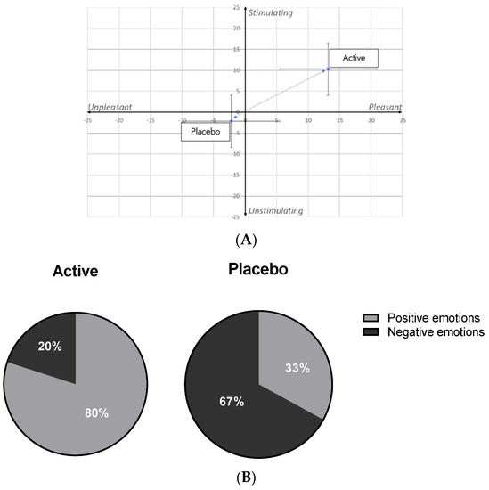 To complete this analysis, the emotional distribution considering stimulating/unstimulating and pleasant/unpleasant emotions scale was analyzed. After 28 days of active lotion application, volunteers triggered stimulating and pleasant emotions while the placebo lotion triggered neutral emotions as shown by its location in the center of emotional valence (Figure 12A). This representation confirms that Pogostemon cablin triggered positive emotions contrary to placebo lotion.