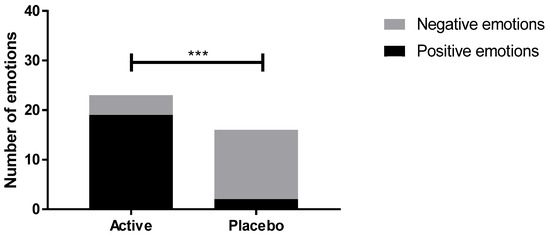 The non-verbal communication after active and placebo lotions application for 28 days was analyzed. This method used a unique grid to analyze over 200 non-verbal reactions (facial reactions, postures, gestures, voice), and remove all verbalization barriers. After 28 days of active lotion application, 19 positives emotions and only four negatives emotions were triggered. In contrast, the volunteers who applied placebo lotion presented inverse emotional response with 14 negatives emotions and only two positives emotions after 28 days (Figure 13). These results demonstrated that Pogostemon cablin extract was able to deliver a positive emotional response in comparison with the placebo lotion. Interestingly, a statistical analysis of the emotional distribution between both products and our results showed that the distribution of emotions is statistically different, demonstrating that Pogostemon cablin extract significantly improves emotional response in comparison with the placebo.