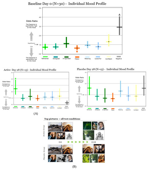 Evaluation of the impact of Pogostemon cablin extract on volunteers’ mood using the picture selection method before and after 28 days of treatment. (A) Quantification of the main moods felt by volunteers. (B) The upper panel represents the main pictures selected by volunteers to evoke the evolution of their mood about their scalp treated with Pogostemon cablin extract, and the lower panel represents the main pictures selected by volunteers who applied placebo lotion.