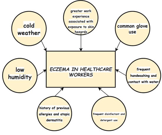 Work-related skin diseases are among the most common work-related diseases, ranking second in frequency after musculoskeletal diseases [1,2]. The majority of work-related skin diseases (80–95%) are contact dermatitis, which can be both irritant and allergic in nature [3,4,5]. Lesions are most commonly described as hand eczema and occur as a result of contact with various substances (irritants and allergens) in the workplace [6,7,8,9,10]. The term “eczema” is generally used to describe a group of skin lesions in which the skin is itchy, dry, and inflamed. However, the term eczema usually involves a non-specific clinical picture but is commonly used in real-life and medical settings when working with patients. Additionally, in the literature, the term “eczema” encompasses a wide range of conditions (ranging from childhood atopic dermatitis to work-related allergies in adults). Therefore, due to such a range, “eczema” serves as an undefined general term for any form of inflammatory skin condition, which is often reported by individuals themselves. Healthcare workers are considered a high-risk population for the development of hand eczema, with prevalence mostly estimated at around 20% compared to a 14.5% lifetime prevalence in the general population [11,12,13,14,15]. Thus far, studies investigating the prevalence/incidence of hand eczema among healthcare workers have mainly been performed with nurses, nursing apprentices, and dental practitioners, rarely being performed with physicians [16]. A recent review of work-related skin diseases among physicians showed a similar prevalence of hand eczema of around 20%, particularly among surgeons, internists, and gynecologists [17]. It has been pointed out that there are little or no data on the specific prevalence of irritant or allergic work-related dermatitis among physicians. Data on surgical and non-surgical physicians and dentists are even scarcer, including the impact of surgical work on work-related contact dermatitis [18]. Therefore, the purpose of this review was to present the literature data on the characteristics of work-related eczema in physicians, dentists, and other healthcare workers and describe environmental and constitutional factors (Figure 1) influencing the occurrence and course of eczema.