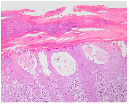Hand eczema is predominantly the consequence/result of the skin coming into contact with different substances. It mainly manifests as contact dermatitis, including irritant contact dermatitis and allergic contact dermatitis, for which the pathogeneses are different. Irritant contact dermatitis and allergic contact dermatitis are relatively frequent dermatoses, with irritant contact dermatitis being more common than allergic contact dermatitis [1,2]. Recognizing and diagnosing them requires a thorough patient history and, crucially, a detailed clinical picture. As the clinical picture is commonly similar in both, patch tests can differentiate the two dermatoses (a positive patch test, along with a history of allergen sensitivity, indicates allergic contact dermatitis) (Figure 2). Sometimes histology may be helpful (Figure 3). Histologically, prominent features of acute irritant contact dermatitis are spongiosis, irregular acanthosis, the dilation of capillaries in the subepidermal dermis, and perivascular infiltration of neutrophils and lymphocytes in the dermis. A diagnosis of chronic irritant contact dermatitis is made based on the history, clinical picture, and negative patch test results, as histological findings are often non-specific. A diagnosis of acute allergic contact dermatitis is also made based on a patient’s history and clinical picture, though with a positive result to a patch test (epicutaneous) using a standard series of allergens or “target allergens”. Histologically, in allergic contact dermatitis, lymphocytic perivascular infiltrate, edema of the dermis, and epidermal spongiosis and exocytosis are observed. Chronic allergic contact dermatitis is also diagnosed based on a detailed clinical picture and patient history, and it is confirmed with a positive patch test result.