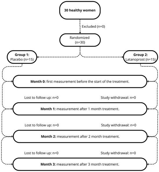 A total of thirty healthy female volunteers between the ages of 18 and 42 years were enrolled in the trial. Among them, fifteen received latanoprost and fifteen received the placebo. All 30 participants completed the study (i.e., none withdrew from the study). All the participants had dark brown irises. None of the participants reported any adverse effects or developed any ophthalmic pathology.