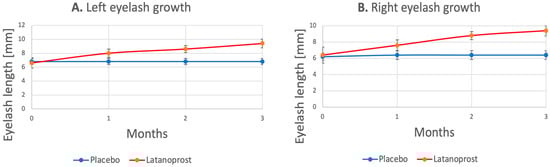 Eyelash growth between placebo (blue line) and latanoprost (orange line) treatments; (A). Left eyelash growth; (B). Right eyelash growth. The data are presented as average, and the error bars indicate standard deviation.