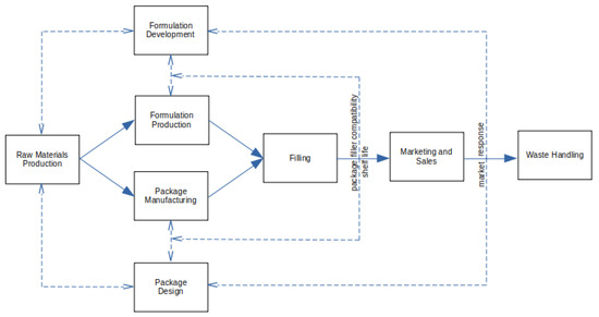 A simplified representation of the traditional cosmetics industry is shown in Figure 1. Solid arrows represent material flows, while dashed arrows are information flows. Packages are designed based on customer requirements in terms of shape, size, color, and finish. Packaging production is typically outsourced (e.g., [2]). Raw materials flow from suppliers to packaging producers. The product is then filled, distributed, and sold without any consideration of the post-use stage. Feedback at any stage is usually related to quality issues and delivery schedules. Each stage represents a complex set of activities and potentially global supply chains. Multiple companies may supply materials and parts to a packaging manufacturer, who may also outsource some of the production steps. Some cosmetics companies regularly add new products, while others may not, depending on their business models [1]. Even when the materials and processes are mostly well-understood, attempts to change packaging materials based on customer demand or cost considerations can be problematic [49].