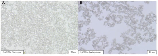 The morphology of AASLMs’ dispersion before freeze-drying, and the redispersion of the dried powder, is shown in Figure 1. The results reveal that the AASLM dispersion exhibited an irregular shape with a size of 20 µm both before freeze-drying and after redispersion of the dried powder.