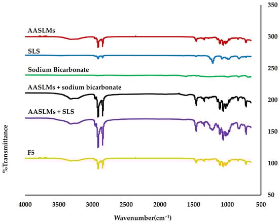 A drug and excipient compatibility study was conducted using Fourier transform infrared spectroscopy (FTIR) (Thermo Scientific model Nicolet iS10, Madison, WI, USA) with the Attenuated Total Reflectance (ATR) technique. FTIR analysis was performed to assess the physicochemical interaction of the drug (AASLM) with the excipients. A homogeneous powder mixture, consisting of an equal amount of AASLMs and each excipient used in the formation (1:1 ratio), was prepared and placed in the diamond plate crystal holder. The spectrum was scanned within a spectral range of 4000–650 cm−1, with a scan speed of 64 and a resolution of 4 cm−1. The evaluation was performed at room temperature [].