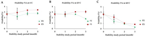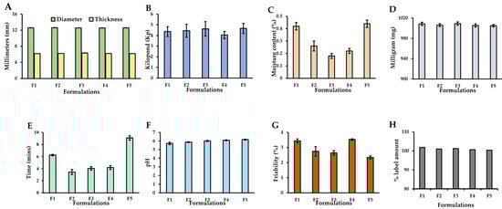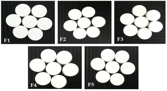 The friability of tablets was measured using a friability tester (Erweka, Model TAR 10, Langen, Germany). Briefly, 10 tablets were dedusted, accurately weighed, and placed into the drum of the friability tester, operating at 25 rpm for 4 min. Subsequently, the rotated tablets were dedusted and reweighed [,]. The percentage of tablet friability was calculated using the following equation: