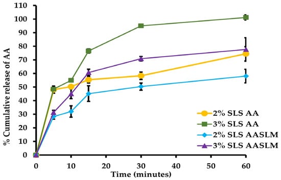 SLMs are lipid-based carrier systems with a micro size range; they constitute glyceride, fatty alcohol, fatty acid, solid wax, and surfactants. SLMs can deliver lipophilic drugs with high entrapment efficiency. The solid matrix of SLMs forms a protecting wall that is generally resistant to adverse environments. Thus, it can protect the incorporated drugs from degradation []. The excipients used in SLMs are generally recognized as safe (GRAS) and are biocompatible and biodegradable. Moreover, SLMs can be produced on a large industrial scale with adequate physical and chemical stability, and they are cost-effective [,]. SLM carriers could promote the solubility of AA by incorporating it into their lipid matrix and consequently enhancing the passage of the drug to the target sites.