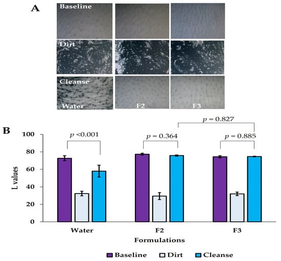 The model dirt used for the cleansing efficacy study was adapted from the Schrader study []. The ingredients included 5 g of mineral oil and 1 g of activated charcoal, which were mixed homogeneously. The activated charcoal was used as a substitute for color.