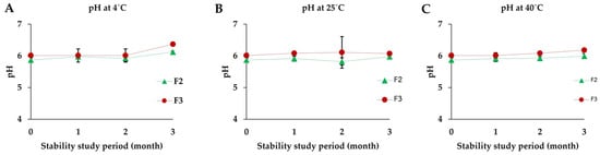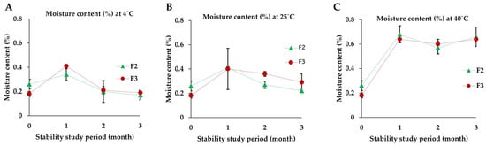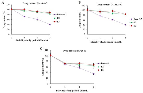 AA content of effervescent cleansing tablets F2, F3, and control powder blend (free AA) stored at (A) 4 ± 2 °C, (B) 25 ± 2 °C, and (C) 40 ± 2 °C (75% RH ± 5% RH) for a duration of 3 months.