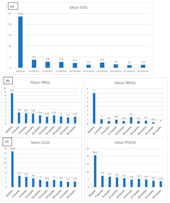 - Miniotti, M.; Ribero, S.; Mastorino, L.; Ortoncelli, M.; Gelato, F.; Bailon, M.; Trioni, J.; Stefan, B.; Quaglino, P.; Leombruni, P. Long-term psychological outcome of patients with moderate-to-severe atopic dermatitis continuously treated with Dupilumab: Data up to 3 years. Exp. Dermatol. 2023, 32, 852–858. [Google Scholar] [CrossRef]