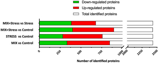 More than 2400 proteins were identified and quantified per the experimental conditions (Figure 1). Among them, proteins with fold-change expression ratios versus the control group higher or lower than the control group or stress group (+1.3- or −1.3-fold change values) were considered, respectively, as upregulated (in red) or downregulated (in green, Figure 1).