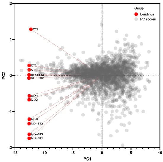 The results of the PCA were visualized though a biplot scaled representation of the loadings (each replicate for experimental group) and PC scores. Proportion of variance PC1 96.26%, PC2 0.81%.
