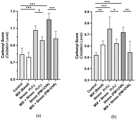 (a) Protein carbonylation of the mitochondrial purified fraction and (b) of the nuclear (histone-enriched) fraction. The levels of protein carbonylation for each experimental condition are reported as vertical bar graph representation of the mean and standard deviation. *** p-value < 0.001 ** p-value < 0.01 * p-value < 0.05 § p-value < 0.1—ANOVA and Tukey’s post hoc multicomparison statistical analyses.
