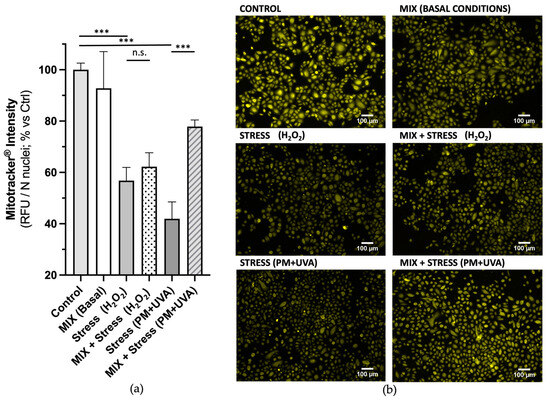 The analysis was performed on n = 5 replicates per experimental group. Right after the stress exposures (H2O2 or pollution) and/or cell treatments with the active MIX, the mitochondrial function evaluation was conducted through an in situ treatment of cells with a Mitotracker® probe, following the provider’s instructions (Red CMXRos; Invitrogen). The control group did not receive any treatment or exposure to stress. The image collection of specific fluorescence signals was performed with the epi-fluorescence imaging system (EVOS M5000; Thermo fisher). The image analysis was effectuated with ImageJ software [50]. The levels of fluorescent probe accumulation in active mitochondria were obtained by integrating the specific intensity of a signal normalized on the surface of the evaluation and N of the nuclei.