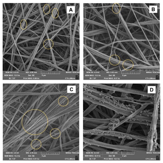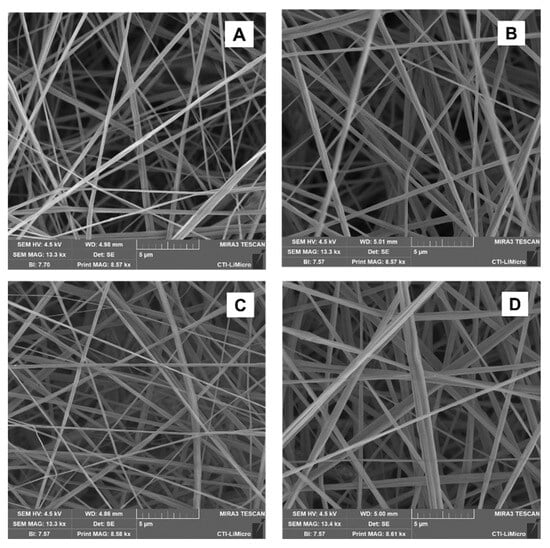 The fibers’ diameters are shown in Table 2. There is statistical significance between the formulations (Tukey test, p < 0.05).