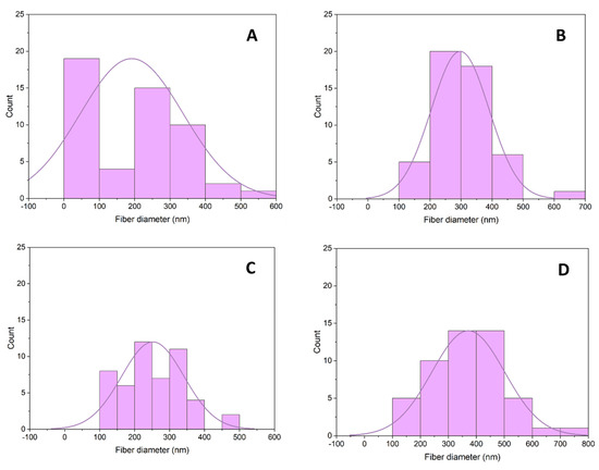 The histograms of the fibers’ diameter distribution are present in Figure 2. There is variation between the four designed formulations. Formulation B shows a more homogeneous diameter distribution and formulation A has a more heterogenous diameter distribution.
