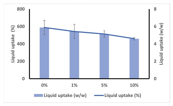The liquid uptake evaluated in simulated physiological conditions, a temperature of 37 °C ± 1 °C, PBS, and pH 7.4, reached values around 600% (Figure 3). There is no statistical difference between the formulations (n = 3).