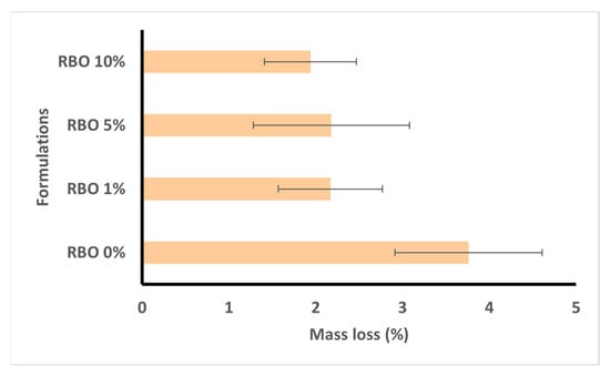 The percentage of mass loss is shown in Figure 5. The value reached between 1.94% and 3.76%. However, there is no statistical difference between the formulations (n = 3).