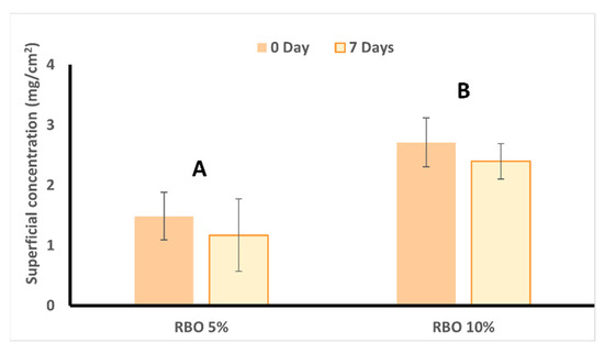 Superficial concentration before and after seven days of RBO release. The different letters indicate statistical significance between the formulations (Tukey test, p < 0.05).