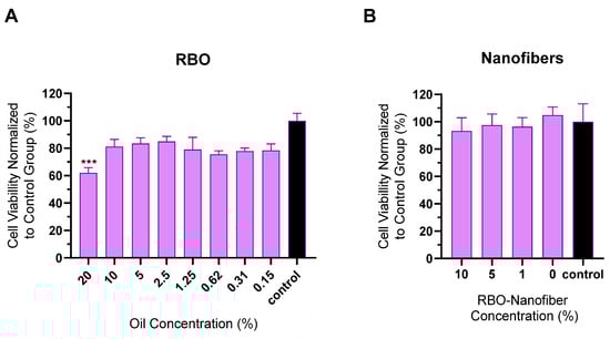 RBO and RBO-incorporated nanofibers viability in SK.MEL.28 cell line. (A) RBO exhibited significant cytotoxicity to human melanoma cells only at a 20% treatment concentration. (B) Nanofibers alone and RBO-incorporated nanofibers did not significantly impact the proliferation of SK.MEL.28 cells. The values were obtained after 48 h of treatment in two independent experiments, each with three replicates (mean ± SEM). Significant differences between the control (black column) and the 20% RBO treatment are represented by *** p < 0.0008.