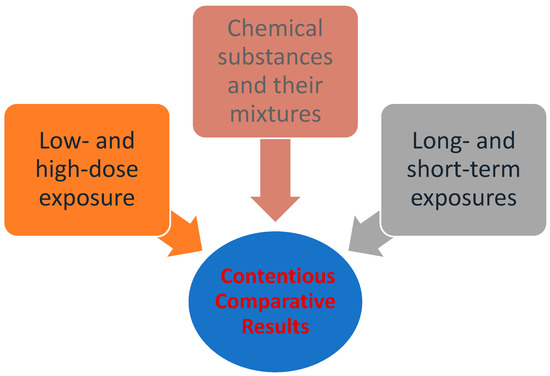Despite the fact that the general approach to quantitative risk assessment (QRA) has remained largely unchanged since the early 1980s, it is continually evolving in various forms, and its fields of application have significantly expanded. Several organizations and research groups have developed or adopted systematic reviews in the assessment of chemical substances. Moreover, there is a growing body of research which focuses on dynamic risk assessment and risk management, rather than static or traditional risk assessment [33]. The use of systematic reviews can identify differences in how questions are formulated, searches are conducted, or studies are evaluated [34]. The application of these methods can lead to improved transparency, objectivity, and communication in risk assessment [35].On the other hand, the process also involves disadvantages, mainly uncertainty resulting from contentious comparative results, such as the assumption that exposure to high doses applies equally to low doses, and that short-term exposures apply equally to long-term ones. Additionally, it often disregards the synergy of multiple sources of exposure (e.g., chemical substances and their mixtures in real-life exposures). Factors such as these which lead to uncertainty in the risk assessment process are illustrated in Figure 1 [36,37]. While scientific knowledge is essential, it is not always adequate for the assessment of risks. In any case, the management of risks falls under the jurisdiction of the competent political bodies of the community, which determine whether a risk is acceptable or not [38].
