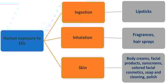 Human exposure to EDs occurs through ingestion of food, dust, and water, inhalation of airborne particles, dermal contact, and maternal exposure [56,57]. The primary exposure route for cosmetics is the skin; most cosmetic products are applied directly to the skin, and their ingredients, or molecules, can penetrate the skin barrier and enter the systemic circulation through various pathways [58]. Additionally, exposure can occur through inhalation, as in the case of fragrances and hair sprays, as well as through ingestion, as in the case of lipsticks [59]. These means of exposure are illustrated in Figure 2. Furthermore, though the environmental risk is not fully understood, it is nonetheless known to exist. Many substances found in cosmetics end up in natural ecosystems through wastewater treatment facilities, water used for personal hygiene, and seawater used by swimmers using sunscreen, as well as through sanitary landfills where residues from cosmetic product packaging may enter the soil [60]. The potential for cosmetic ingredients to bioaccumulate in the fatty tissue of fish [61], the presence of such ingredients in marine mussels [62], and the ability of UV filters to cause coral bleaching [63] are all important environmental concerns [64]. However, there are limitations in scientific evidence, and it is challenging to establish absolute certainty, as some EDs can have adverse effects even at low doses. Moreover, establishing a causal relationship between exposure and the outcome of a disease is nearly impossible to confirm [65,66].
