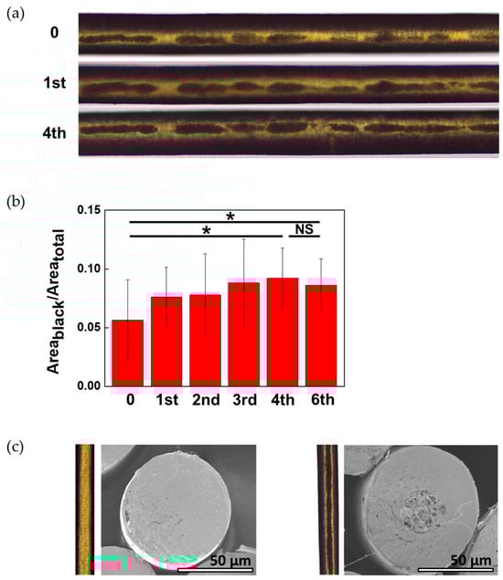 Figure 1a shows transmission images of the inside of the hair taken by focusing the light on the inside of the hair in transmission mode. Because hair is circular, the transmitted light at the sides of the hair is refracted and appears black (the light does not reach the senses). The black area in the middle is believed to be a porous structure formed when the vacuoles inside the hair are damaged [
