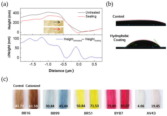 Figure 4c, the hair treated with 1% polyethyleneimine aqueous solution showed high color change (ΔE) regardless of the molecular weight of the dye. Therefore, it can be concluded that the hair treated with polyethyleneimine was cationic.