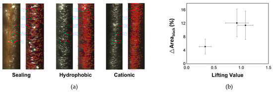 When cuticle sealing was performed, the change in the dark area was 5.11%. In the case of the hydrophobic coating, it was 12.14%, and in the case of the cationic coating, it was slightly lower at 11.45%. In the case of untreated hair, the change in porosity was 15.5%, indicating that the hydrophobic and cationic treatments reduced the porosity.