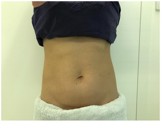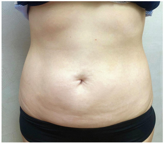 After undergoing a comprehensive treatment regimen consisting of microfocused ultrasound with 850 shots, 5 mL of calcium hydroxylapatite (CaHA) diluted with a 1:1 ratio of normal saline and injected on both sides of her abdomen, and 50 units of IncoBTX-A exclusively administered to the left side of her abdomen for the purpose of comparing the results, the patient experienced notable improvements in her abdominal appearance (Figure 6 and Figure 7). Particularly, the addition of IncoBTX-A to the left side of her abdomen yielded more significant enhancements compared to previous cases, and the inclusion of CaHA further augmented the overall outcome.