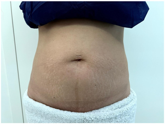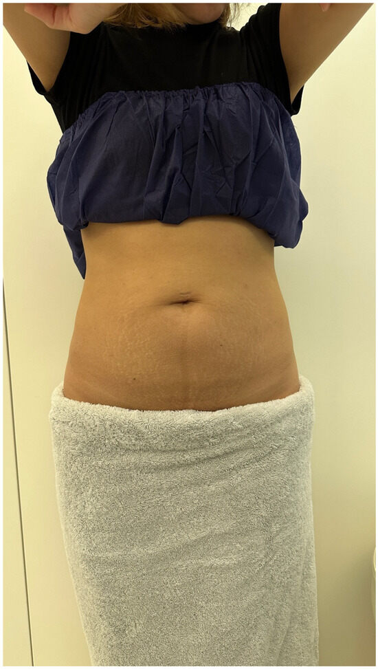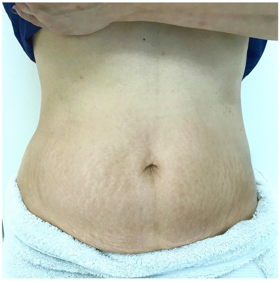 During the physical examination, visible fine lines and irregular contours were observed in the abdominal region, although the presence of striae was not significant (Figure 3). Subsequently, the patient underwent Microfocused Ultrasound treatment consisting of 810 shots.