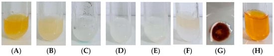 Phytochemical screening results of sacha inchi seed oil (A) using reagents, including FeCl3 5% (B), FeCl3 1% (C), concentrated HCl + Mg (D), H2SO4 (E), NaOH 10% (F), agitation followed by heating (G), concentrated H2SO4 + acetic anhydric, and Dragendorff (H).