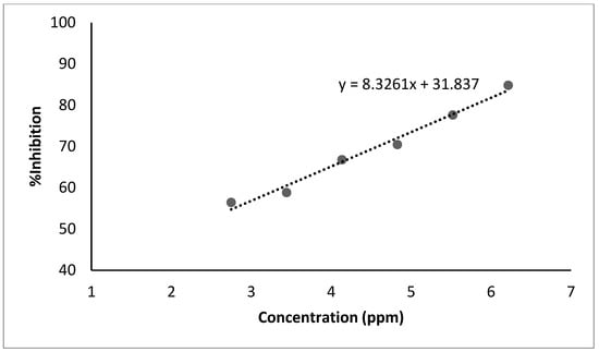 The DPPH radical scavenging experiment was modified slightly from Liua et al. [24] to assess the antioxidant ability of sacha inchi seed oil. A total of 4 mg of DPPH was weighed and dissolved in 25 mL of ethanol pa so that the concentration of the DPPH reagent was 160 µg/mL, and it was diluted to reach the concentration of 40 µg/mL. The standard used was ascorbic acid with varying concentrations of 1 µg/mL, 2 µg/mL, 3 µg/mL, 4 µg/mL, 5 µg/mL, and 6 µg/mL in ethanol pa. Then, various concentrations of sacha inchi seed oil were made: 15.625 µg/mL, 31.25 µg/mL, 62.5 µg/mL, 125 µg/mL, 250 µg/mL, and 500 µg/mL in ethanol pa. In each, a total of 1 mL of sample and standard solution was put into a different vial and 1 mL of DPPH solution was added to each solution, then homogenized and incubated for 30 min in dark conditions and not exposed to light directly. After that, the absorbance value at the maximum wavelength (λ), 515 nm, was measured. All experiments were carried out in triplicate, and the IC50 value was calculated by % inhibition using the following Formula (8):