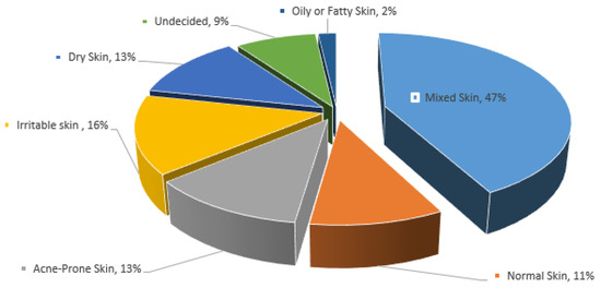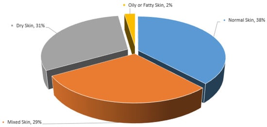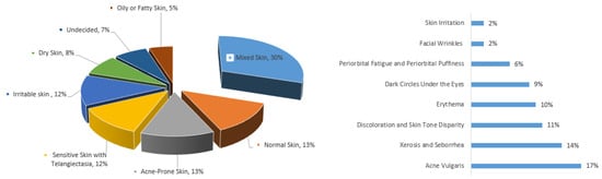 This group included 40 students aged between 18 and 28 years. As skin condition is generally associated with the perception of overall health, participants had their skin type determined, and they reported the problems they experienced in relation to their skin. The majority of the women had a mixed skin type, characterized by a combination of different skin types on different parts of the face. Specifically, most of them had an oily T-zone (forehead, nose, and chin), while the cheeks were normal. In terms of dermatologic skin problems, acne vulgaris was the most frequently occurring issue. The skin types and skin conditions experienced by study participants are outlined in Figure 2.