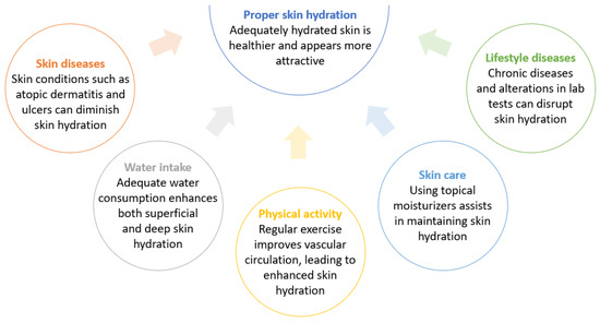 The results of the study indicate varying levels of hydration in the different areas of the body. The skin on the face was the most hydrated, followed by neckline skin, neck skin, and the skin on the leg. Young women prioritize caring for the skin on their face the most; however, the measured values show a fairly high level of hydration of the neck skin despite not taking adequate care of it. The consumption of adequate amounts of water and physical activity were linked with better skin hydration. Multiple factors contribute to adequate skin hydration, with the most crucial ones highlighted in Figure 5.