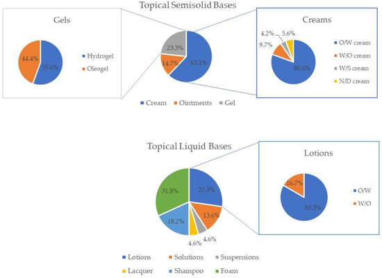 Frequency of each type of dosage form of the topical semisolid bases (creams, ointments, and gels) and topical vehicles (lotions, solutions, suspensions, lacquer, shampoos, and foams) analyzed.