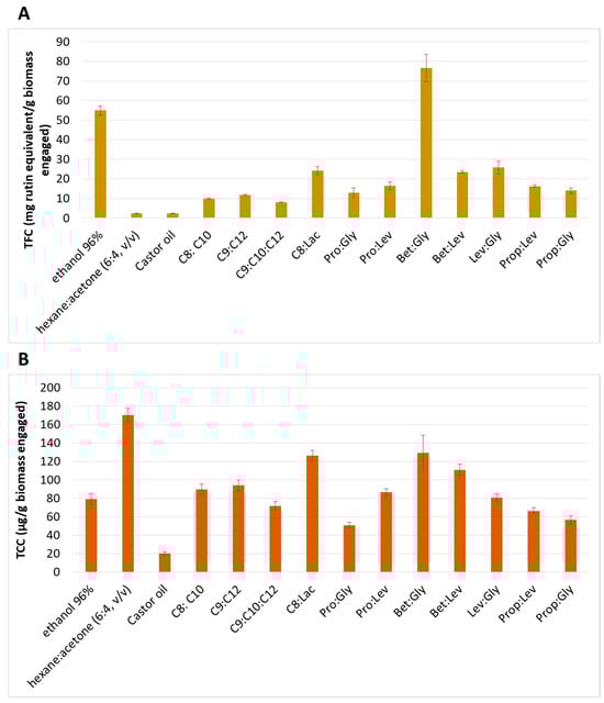 TFC (A) and TCC (B) of extracts from preliminary screening of NaDESs.