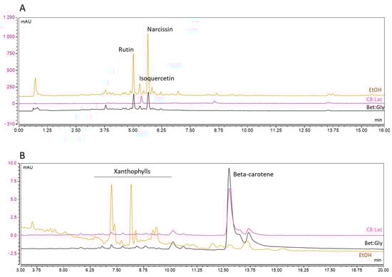 C8:Lac and Bet:Gly were found to be the best choice for the simultaneous extraction of flavonoids and carotenoids from Calendula flowers. HPLC analysis was performed on both extracts and compared to the EtOH extract, which served as a relevant reference for cosmetic ingredients. The EtOH extract contained low levels of carotenoids, specifically xanthophylls (retention time between 4 and 5.5 min). The carotenoid profiles of C8:Lac and Bet:Gly were similar, dominated by beta-carotene (Figure 2). In terms of flavonoid content, EtOH and Bet:Gly contain two major flavonosides (rutin and narcissin) and a smaller amount of isoquercitrin. C8:Lac, on the other hand, contains only a small amount of isoquercitrin, which is expected due to its lower polarity as a NaDES.