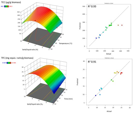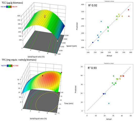 Considering carotenoids, the most critical factor appeared to be the solid/liquid ratio and the rotation speed, whereas for the flavonoids, the solid/liquid ratio and time were the most significant factors. The R2 of the two RSMs were in good agreement between the adjusted and predicted value (less than 0.2 of difference) (see Table S3). The TCC and TFC could then be reliably predicted by the following equations: